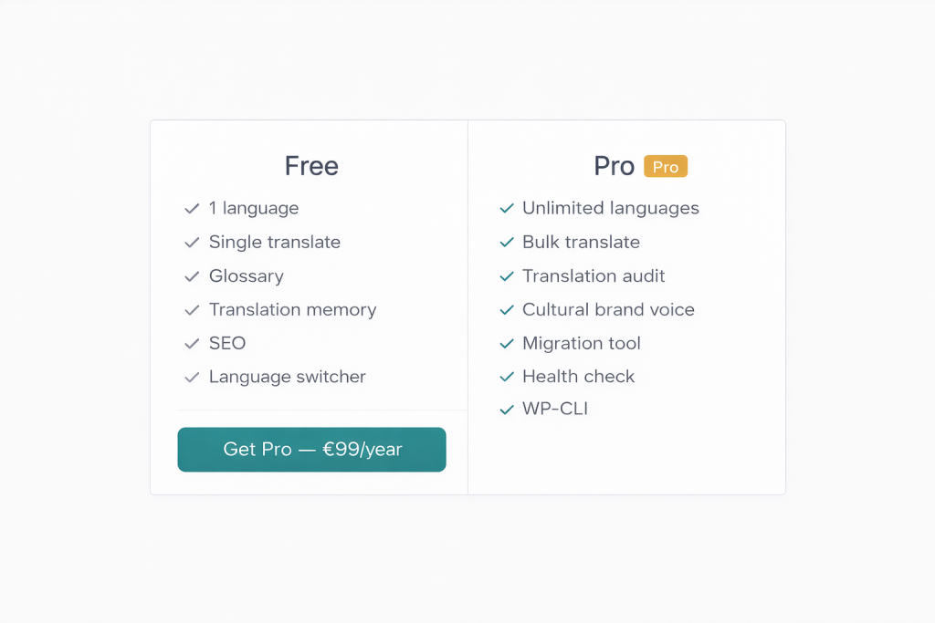TePD Translator Pro is de premium add-on voor de gratis TePD Translator plugin. Waar de gratis versie je site vertaalt naar één taal, verwijdert Pro alle beperkingen en voegt krachtige productiviteitstools toe.